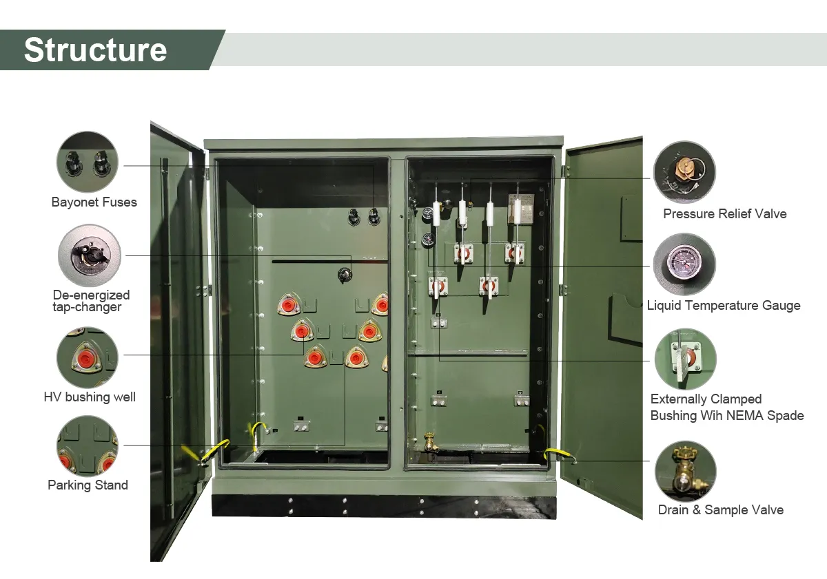 تم تصميم وتصنيع المحولات الثلاثية الطور المثبتة على قواعد لتتوافق مع جميع معايير ANSI وDOE2016 المعمول بها. جميع المحولات مملوءة بالزيت، بدرجة حرارة ارتفاع 65 درجة مئوية، ومصممة لظروف الخدمة المعتادة وفقًا لـ IEEE C57.12.00. التصنيفات المتاحة تتراوح من 30 إلى 3000 كيلو فولت أمبير مع جهود أولية من 2.4 إلى 35 كيلو فولت (150 كيلو فولت BIL) وجهود ثانوية تصل إلى 600 فولت. جميع تكوينات النقر القياسية متاحة: جهد مزدوج في معظم التركيبات، جهد مزدوج مع نقر فقط (اتصال تسلسلي فقط) وخيارات المعاوقة والخسائر متاحة في معظم التصميمات.